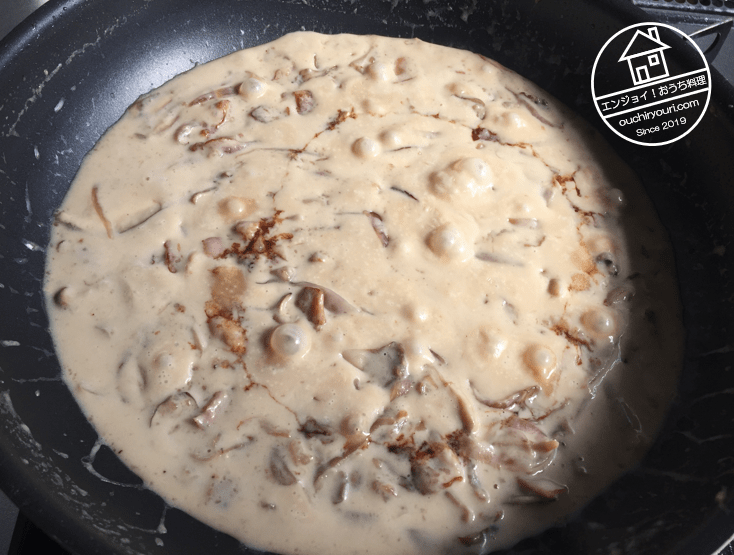 牛乳と豆乳を加えてクリーム状にしました。豆乳を加えた理由は牛乳が足りなかったためです。豆乳でも違和感はなかったです。クックパッドのレシピは醤油を少量加えるようになっていたので加えてみました。味見してみたのですが、醤油はいらなかったと思います。