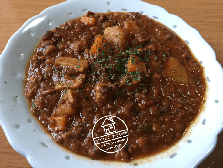 豆、トマト、牛ひき肉はコンカンに必須の食材です。我が家ではその他にジャガイモ、ニンジン、茄子、エリンギ、ピーマン、玉ねぎ、冷凍飴玉ニンニク、生トマトを加えます。色々と加えすぎな気もしますが、色々と加えないと味のバランスが悪く味気ないように感じます。