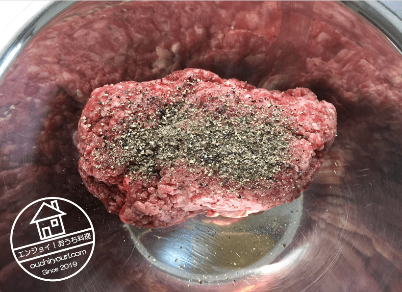パティを作ります。国産牛ひき肉400gに黒胡椒を振って、軽く捏ねて成形します。
