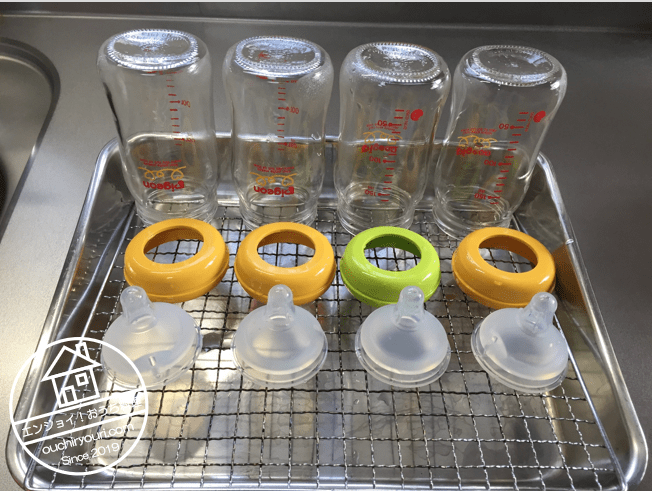 哺乳瓶は出が良くて簡単に飲めるせいか、飲みっぷりがとても良いです。いつも数分で一気に飲み切ってしまいます。使用済みの哺乳瓶が4-5本溜まったら洗浄と熱湯消毒を行います。5本あれば僕が仕事に行っている間もたすことができます。
