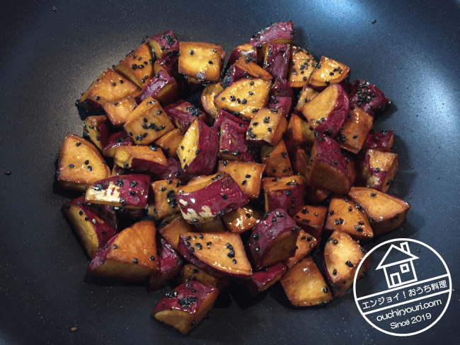 揚げ芋をタレにからめ、黒ゴマをまぶしたら完成です。