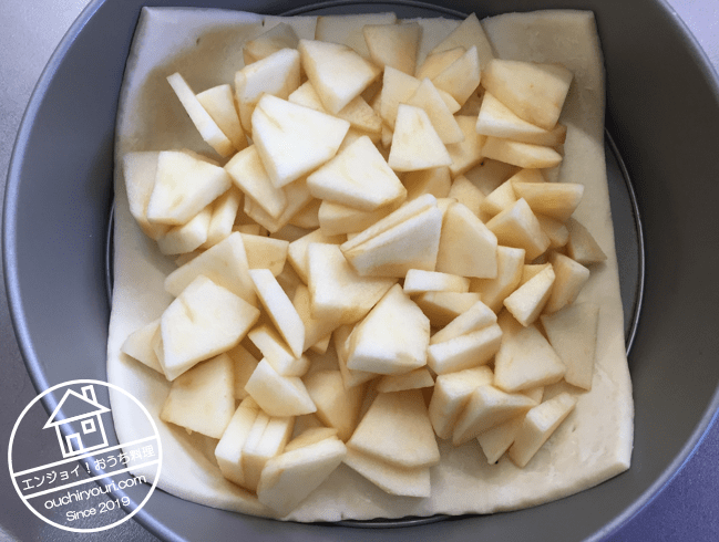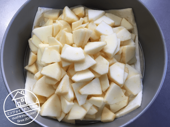 ケーキ型にパイシートを1枚敷き、上に生リンゴ1個分を盛ります。備考ですが、パイシートは焼くとケーキ型に引っ付くのでクッキングシートを敷いておいた方が良かったです。