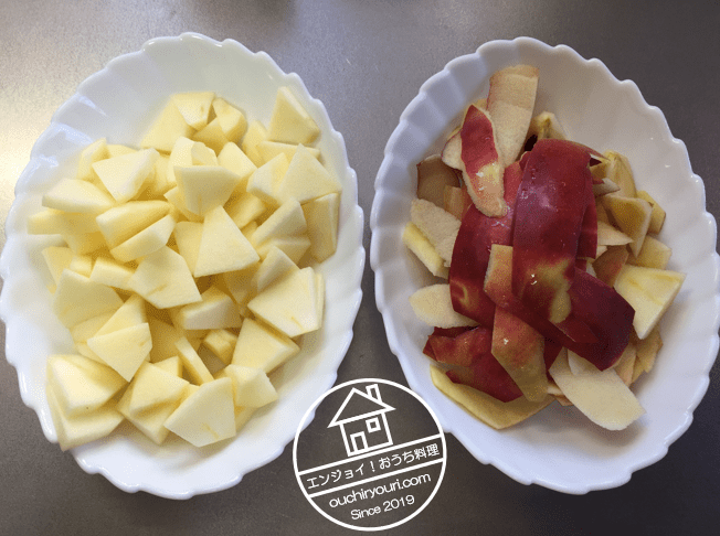 そのままでも食べられましたが、折角なんでアップルパイを作ることにしました。アップルパイの作り方は妻に教わりました。紅玉は皮を剥き、銀杏切りにします。皮と芯はアップルティーにするのでとっておきます。