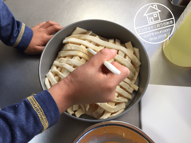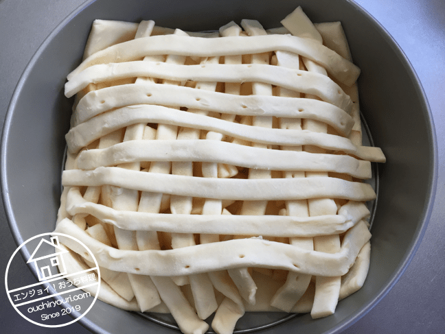 細長く切った生地を格子状に上に盛ります。格子状に盛る理由は恐らく具の水分を飛ばすためだろうと思います。焼くときにリンゴの水分が飛び、濃縮されます。