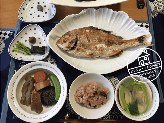 メニューは、煮物、吸い物、鯛、赤飯、香の物、歯固めの石です。それでは早速作っていきましょう!