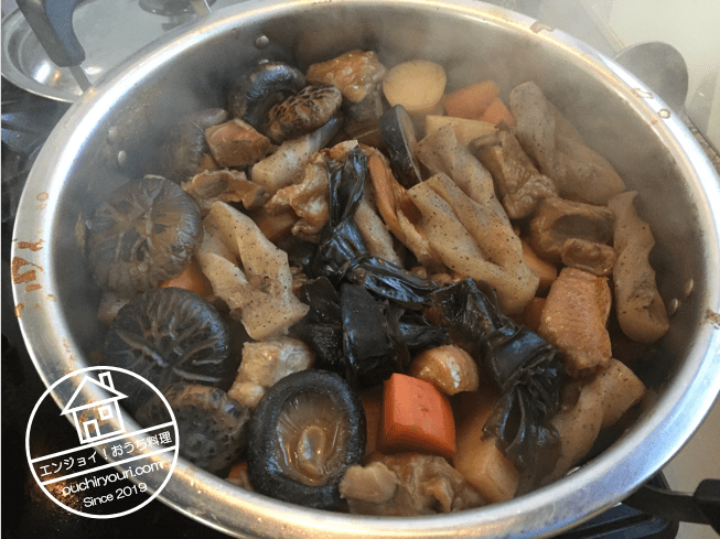 干し椎茸とその戻し汁、蓮根、こんにゃく、里芋、人参、鶏肉を和の調味料(酒、砂糖、味醂、醤油)で煮ます。薄味で少し煮て、一晩おき味を染み込ませます。一生に一度の儀式なので、椎茸は奮発してどんこにしました。