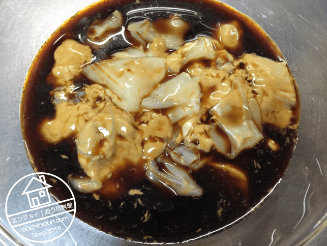 いつも行く鮮魚店で立派なイカ肝が捨て値で売られていたので飛びつきました。鮮魚店の目的はイカ刺しで、イカ肝はいらないようです。勿体ないことです。