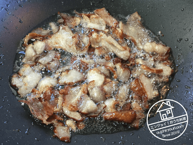 ベーコンをこんがり炒めて脂を出します。この脂は使うので捨てません。