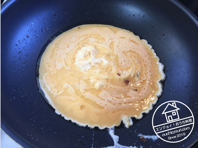 卵を溶き、えごま油を加え馴染ませます。えごま油を加える理由はオメガー3脂肪酸を摂取するためと、卵をふっくらさせるためです。ベーコンの油に溶き卵を加え中火で加熱します。