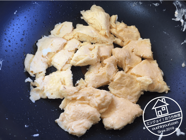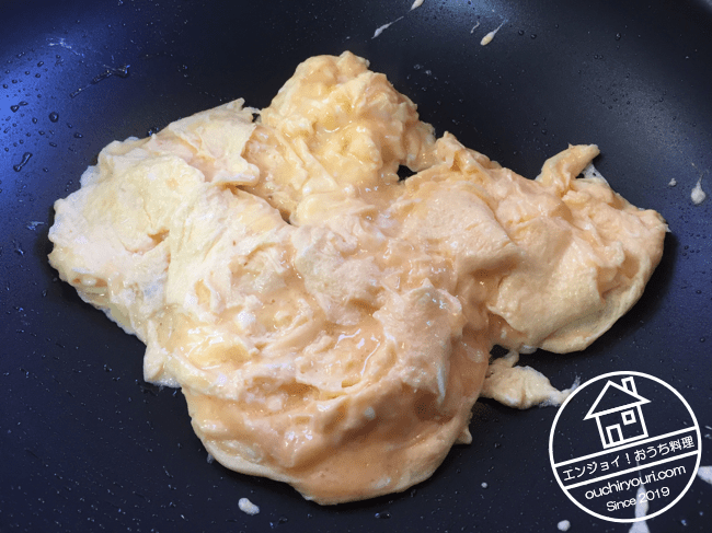 固まったら加熱を止めます。火を通し過ぎないのもポイントです。ヘラで大きく切り分け取り出します。