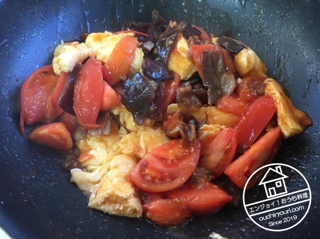 トマトを油で炒め、少し溶けてきたらベーコンときくらげを投入し、混合調味料も加えます。トマトはどんどん溶けてくるのでここからは手早くいきます。