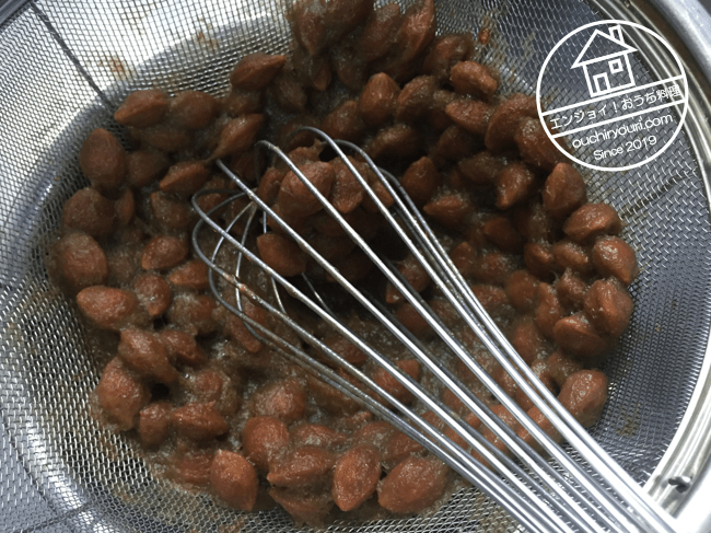 穴径1cmくらいの目の粗いざるがあれば種をこしとれたのですが、なかったので別の方法をとりました。おたまで上澄みをすくいとり、種を1個ずつトングで拾いました。