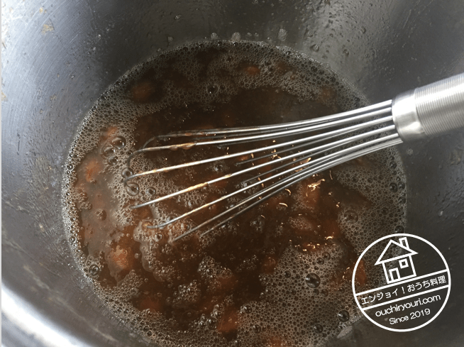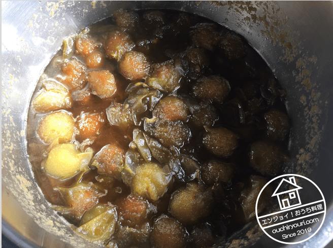 加熱を続けると身が崩れてグズグズになります。梅は種があるので、種抜きが必要です。ここからが一仕事です。泡立て器で撹拌し種から身を剥がします。