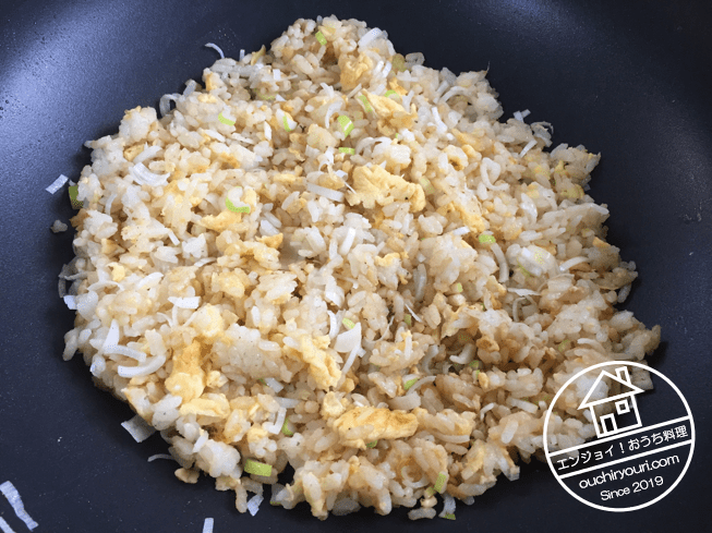 卵とご飯を炒めたら鍋肌に醤油を加え混ぜて馴染ませます。次いでカラスミパウダー、ガーリックソルト、旨味調味料、刻みネギを加えます。