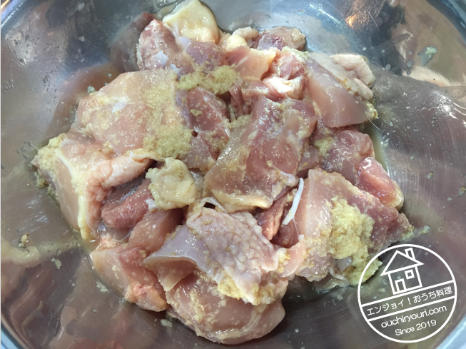 梅味噌は酢豚の味付けに適していると思っています。今回は豚肉がなくて鶏腿肉があったので、それを使います。ですので酢鶏です。鶏腿肉を一口大に切り、おろし生姜を酒に分散させて鶏肉に合わせ暫くおきます。臭み消しの処理です。梅味噌が塩分を持っているので、塩気は加えません。