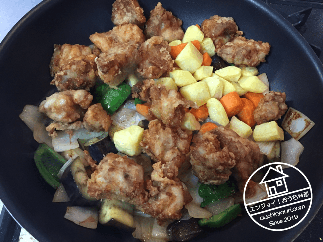 ジャガイモと人参を素揚げにし、鶏肉は唐揚げにします。省略していますが、結構な手間です。ジャガイモと人参はもっと多くて良かったです。特にジャガイモ。