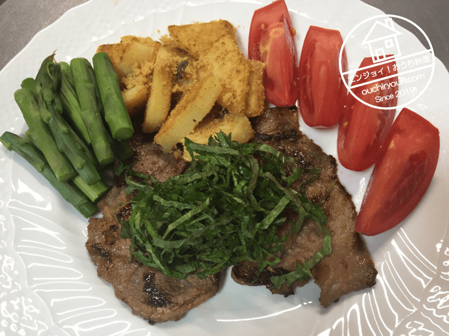 肉にアスパラガス、カラスミポテト、トマトを添えたら彩が綺麗になりました。庭に大葉が沢山生えてきたので、大葉の千切りを肉に乗せました。